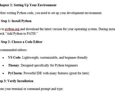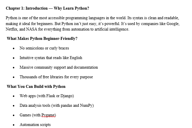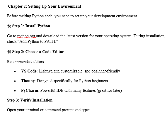 You’re getting 50+ pages of step‑by‑step Python instruction, real examples, and easy‑to-follow explanations — perfect for first‑time programmers.
